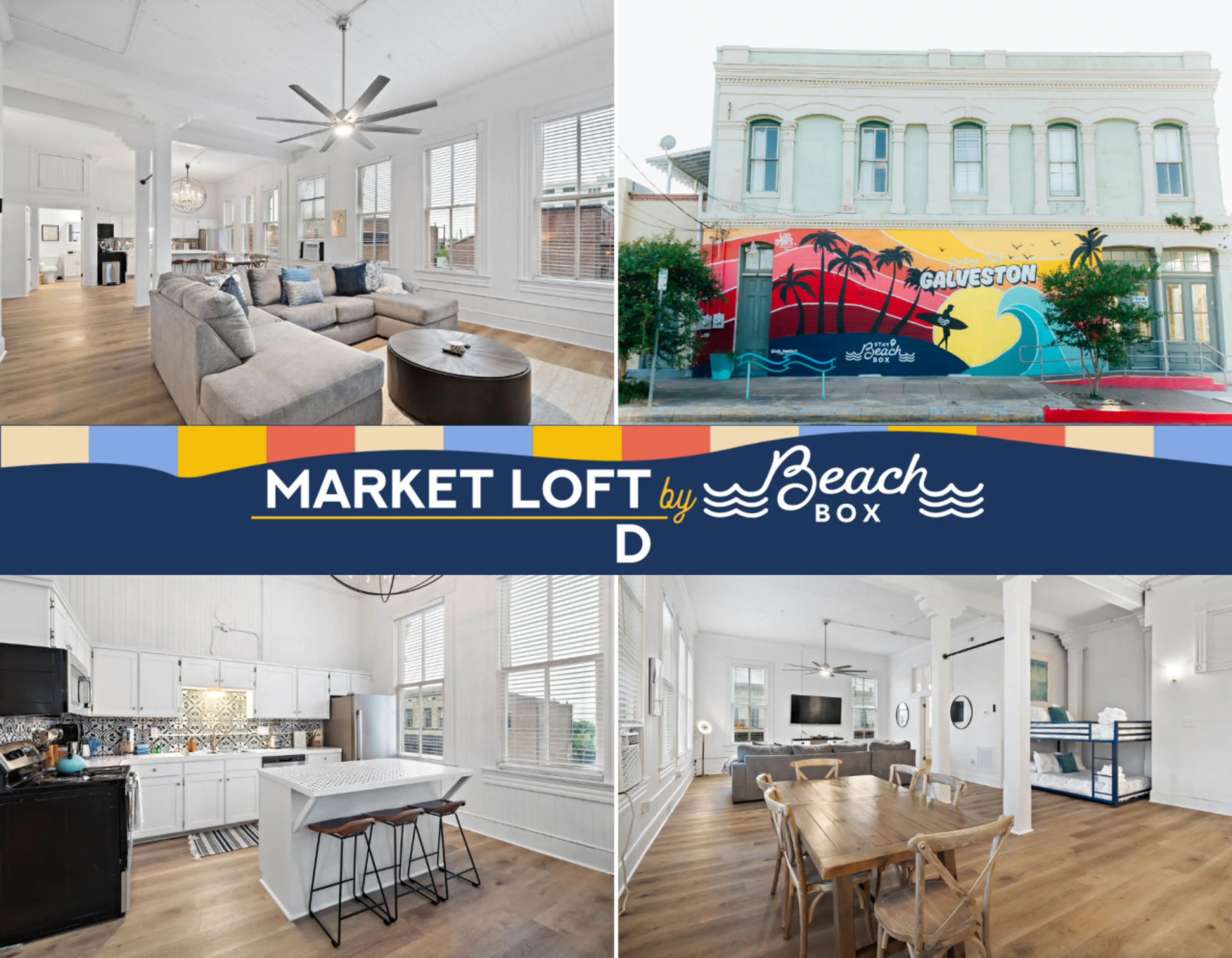 Welcome to Market Street Loft D– a stunning, spacious historic loft in the heart of downtown Galveston. Enjoy high lofted ceilings, oversized windows with views and a beautifully updated kitchen. The king size bed in the primary bedroom plus the full over full bunk bed nestled off the main living sp...